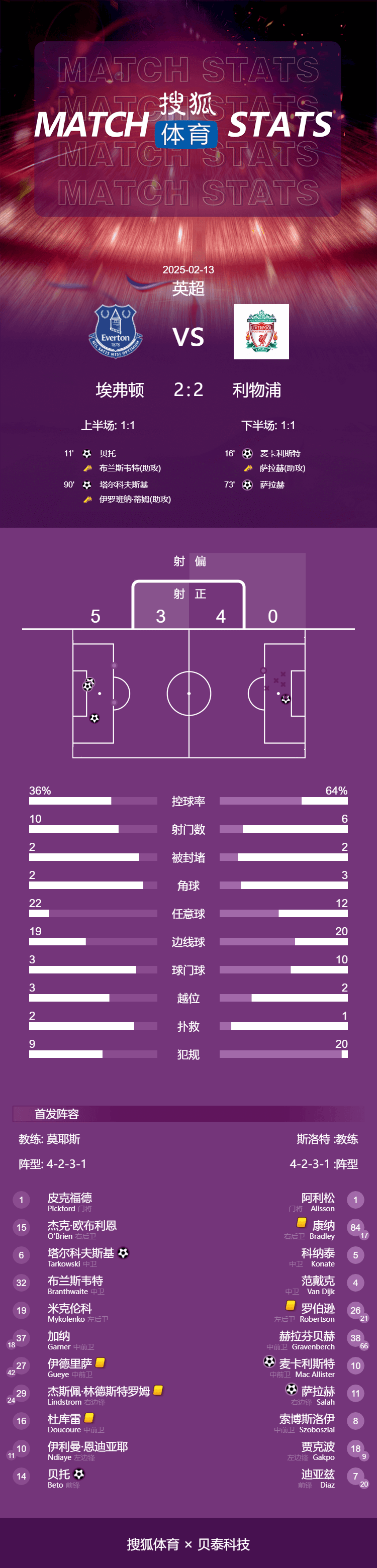 第11分钟,埃弗顿取得领先,布兰斯韦特快开任意球直塞,贝托前插获得单刀机会,他在点球点前面对利物浦门神阿利森低射破门,1-0!贝托斩获本赛季英超第4球,这也是他各项赛事第6球。